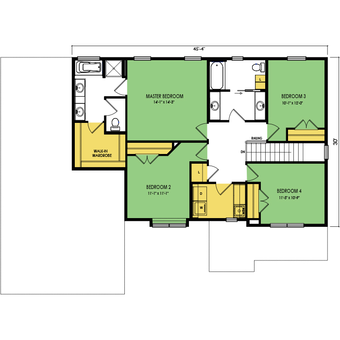 A part of our dream series, the tamarack floor plan features 3 bedrooms and 1.5 bathrooms with a foot print of 44x30 feet and 1342 total square feet of living space.